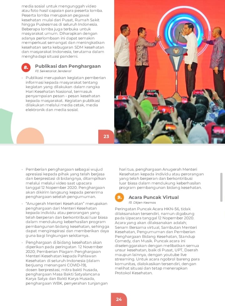 Menariknya, puncak acara HKN 2020 akan digelar pada 12 November 2020. Berupa Upacara, Senam Virtual Bersama, Sambutan Menteri Kesehatan, Pengumuman dan Pemberian Penghargaan Bidang Kesehatan, Standup Comedy dan Hiburan Musik. (Yud/DT).