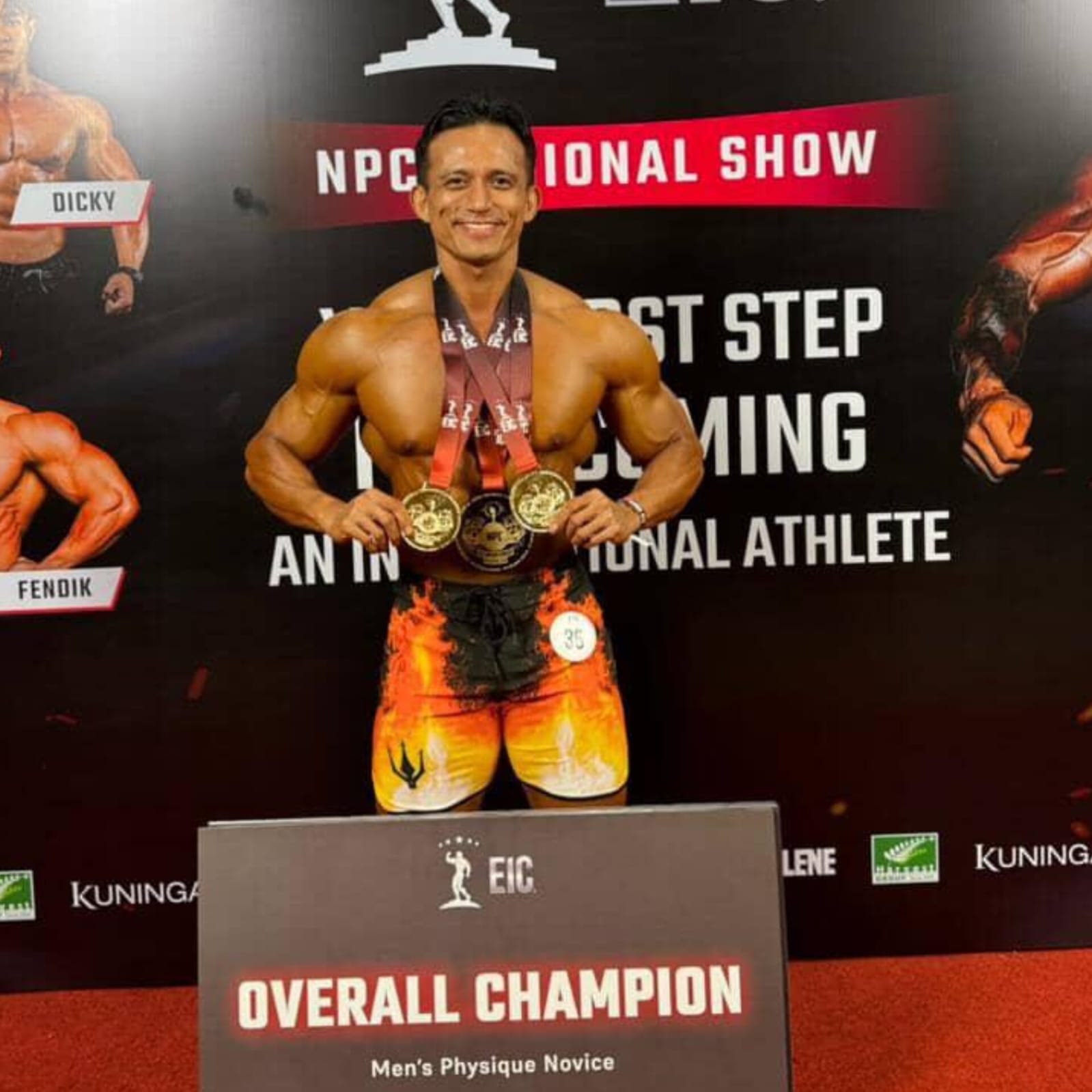 Yakni, 1st Men’s Physique Novice Class A, 1st Overall Champion Men’s Physique Novice, dan 1st Men’s Physique Open Class A.
