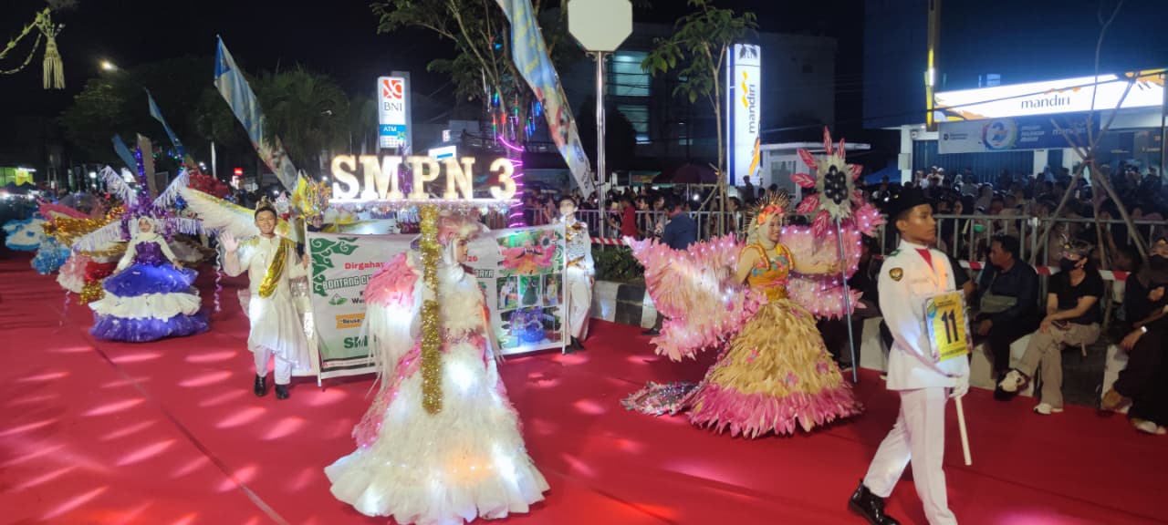 Salah satu yang menarik perhatian SMPN 3 Bontang. Tak hanya tampil kreatif. Mereka juga menunjukkan kepercayaan diri tinggi. Lewat karya kostum daur ulang buatan sendiri.