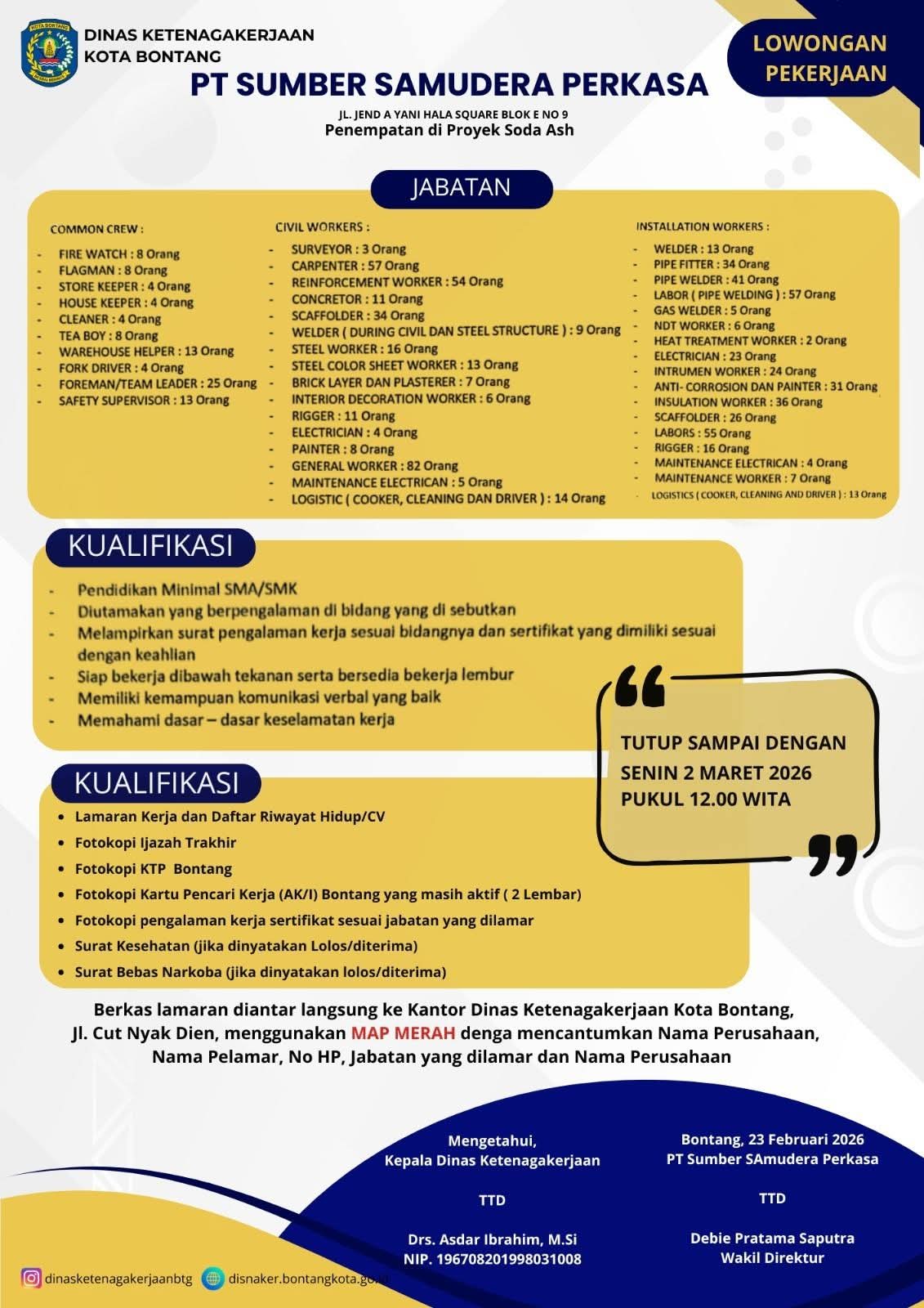 Dialektis.co, Bontang – Kabar baik bagi pencari kerja di Kota Bontang. PT Sumber Samudera Perkasa yang merupakan perusahaan lokal Kota Taman, membuka peluang kerja besar-besaran dengan total kebutuhan 827 tenaga kerja untuk penempatan di proyek Pabrik Soda Ash.
