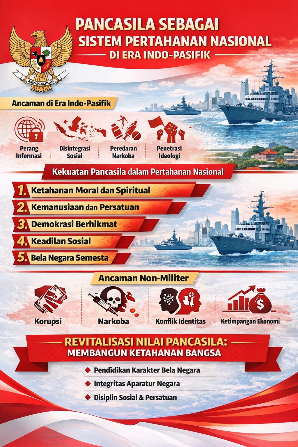 Korupsi, narkoba, konflik identitas, dan ketimpangan ekonomi adalah bentuk ancaman non-militer yang secara langsung melemahkan pertahanan nasional.