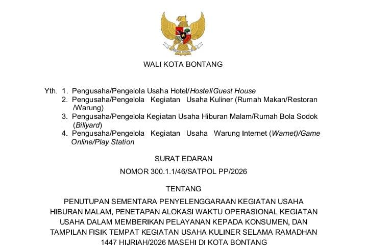 Dalam surat edaran itu ditegaskan, sejumlah tempat hiburan malam wajib tutup sementara mulai 13 Februari 2026 hingga tujuh hari setelah Hari Raya Idulfitri 1447 Hijriah.